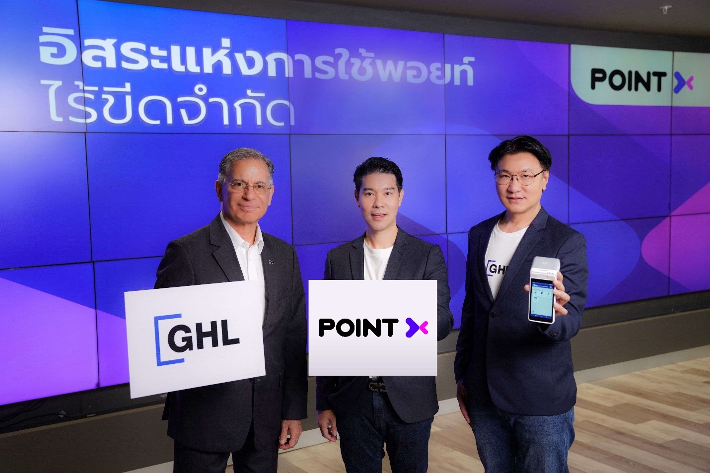 PointX หวังเป็นอย่างยิ่งว่าความร่วมมือในครั้งนี้จะทำให้ลูกค้า PointX ได้รับสิทธิประโยชน์จากการสแกนจ่ายด้วย PointX ได้อย่างหลากหลายและง่ายดายมากยิ่งขึ้น ถือเป็นการมอบประสบการณ์การใช้งานที่สะดวกสบายและครอบคลุมทุกไลฟ์สไตล์ของผู้ใช้งาน โดยได้รับเกียรติจาก นายเกียรติศักดิ์ วิศิษฏ์บัณฑิตกุล ผู้บริหารแอปพลิเคชัน PointX พร้อมด้วย มร. ฌอน เอส เฮช (Mr. Sean S. Hesh) Group Chief Executive Officer บริษัท จีเอชแอล ซิสเต็ม เบอร์ฮาด และ นายปริญญา จินันทุยา กรรมการผู้จัดการ บริษัท จีเอชแอล (ประเทศไทย) จำกัด พร้อมทีมผู้บริหารจากบริษัทพาร์ทเนอร์ชั้นนำ ประกอบด้วยบริษัท ไอแคร์ เฮลท์ จำกัด ผู้ประกอบธุรกิจร้านขายยา 4 แบรนด์ ได้แก่ “iCare” “Pharmax” “vitaminclub” และ “Super Drug”, ร้านเครื่องหอม Karmakamet, และร้านอาหารในเครือบริษัทรวยไม่หยุดจำกัด ที่ร่วมกันเปิดแคมเปญ เมื่อเร็วๆ นี้
